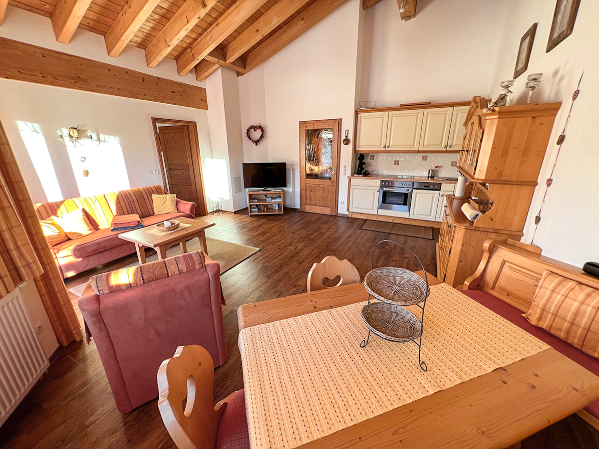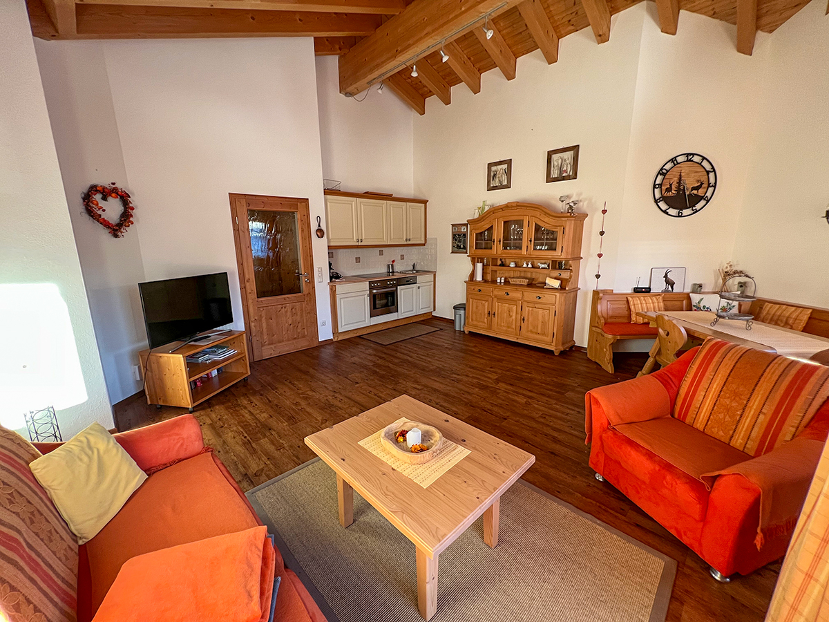 Unser Appartement verfügt über einen offenen Wohn- und Essbereich mit Ausziehcouch und ist mit einem voll eingerichteten Küchen­bereich (Herd, Backofen, Spülmaschine, Senseo-Kaffeemaschine, Filterkaffeemaschine, Wasserkocher, Toaster), SAT-TV und Fön ausgestattet. Bettwäsche und Handtücher sind ebenfalls inklusive. Zusätzlich verfügt das Haus über einen Skikeller mit Skischuh­wärmer und einen eigenen Parkplatz vor dem Haus.